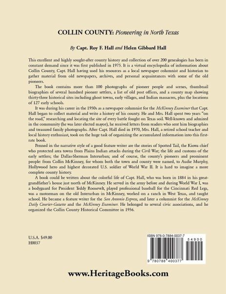 This excellent and highly sought-after county history and collection of over 200 genealogies has been in constant demand since it was first published in 1975. It is a virtual encyclopedia of information about Collin County, Capt. Hall having used his resources as a local newspaper columnist and historian to gather material from old newspapers, archives, and personal acquaintances with some of the old pioneers. The book contains more than 100 photographs of pioneer people and scenes, thumbnail biographies of several hundred pioneer settlers, a list of old post offices, and a county map showing thirty-three historical sites including ghost towns, early villages, and Indian massacres, plus the locations of 127 early schools. It was during his career in the 1950s as a newspaper columnist for the McKinney Examiner that Capt. Hall began to collect material and write a history of his county. He and Mrs. Hall spent two years "on the road," researching and locating the site of every battle fought on Texas soil. Well-known and admired in the community (he was later elected mayor), he received letters from readers who sent him biographies and treasured family photographs. After Capt. Hall died in 1970, Mrs. Hall, a retired school teacher and local history enthusiast, took on the huge task of organizing the accumulated information into this first-rate book. Penned in the narrative style of a good feature writer are the stories of Spotted Tail, the Kiowa chief who protected area towns from Plains Indian attacks during the Civil War; the life and customs of the early settlers; the Dallas-Sherman Interurban; and of course, the county's pioneers and prominent people: from Collin McKinney, for whom both the town and county were named, to Audie Murphy, Hollywood hero and highest decorated U.S. soldier of World War II. It is hard to imagine a more complete county history. A book could be written about the colorful life of Capt. Hall, who was born in 1884 in his great-grandfather's house just north of McKinney. He served in the army before and during World War I, was a bodyguard for President Teddy Roosevelt, played professional baseball for the Cincinnati Red Legs, was a motorman on the old Interurban in McKinney, worked on a ranch in West Texas, and taught school. He became a feature writer for the San Antonio Express, and later a columnist for the McKinney Daily Courier-Gazette and the McKinney Examiner. He belonged to several civic associations, and he organized the Collin County Historical Committee in 1956.