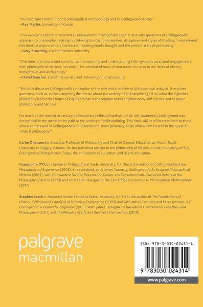 1. Introduction: The Armchair and the Pickaxe.- 2. An Essay on Collingwood; Bernard Williams.- 3. The Development of Collingwood's Metaphilosophical Views; James Connelly.- 4. Collingwood on the Relationship between Metaphysics and History; Jan van der Dussen.- 5. Presuppositions and the Logic of Question and Answer; Vasso Kindi.- Collingwood, Pragmatism and the Philosophy of Science; Elena Popa.- 6. Why Epistemic Pluralism Does Not Entail Relativism: Collingwood's Hinge Epistemology; Giuseppina D'Oro.- 7. Oscillation and Emancipation: Collingwood on History and Human Nature; Karim Dharamsi.- 8.Collingwood and the Philosophy of History: the Metaphilosophical Dimension; Jonas Ahlskog.- 9. The Later Collingwood on Method: Re-enactment and abduction; Chinatsu Kobayashi and Mathieu Marion.- 10. Collingwood and Archaeological Theory; Stephen Leach.- Index