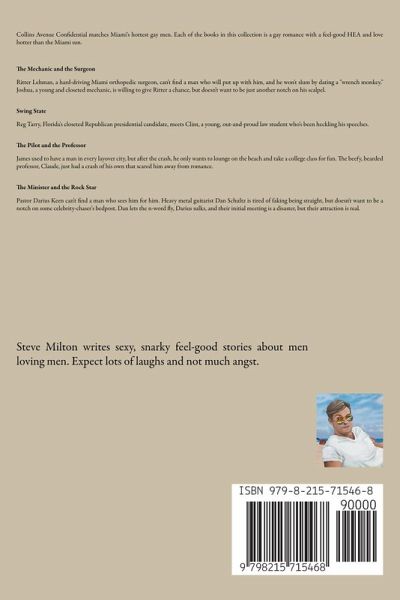 Collins Avenue Confidential matches Miami's hottest gay men. Each of the books in this collection is a gay romance with a feel-good HEA and love hotter than the Miami sun. The Mechanic and the Surgeon Ritter Lehman, a hard-driving Miami orthopedic surgeon, can't find a man who will put up with him, and he won't slum by dating a "wrench monkey." Joshua, a young and closeted mechanic, is willing to give Ritter a chance, but doesn't want to be just another notch on his scalpel. Swing State Reg Tarry, Florida's closeted Republican presidential candidate, meets Clint, a young, out-and-proud law student who's been heckling his speeches. The Pilot and the Professor James used to have a man in every layover city, but after the crash, he only wants to lounge on the beach and take a college class for fun. The beefy, bearded professor, Claude, just had a crash of his own that scared him away from romance. The Minister and the Rock Star Pastor Darius Keen can't find a man who sees him for him. Heavy metal guitarist Dan Schultz is tired of faking being straight, but doesn't want to be a notch on some celebrity-chaser's bedpost. Dan lets the n-word fly, Darius sulks, and their initial meeting is a disaster, but their attraction is real.