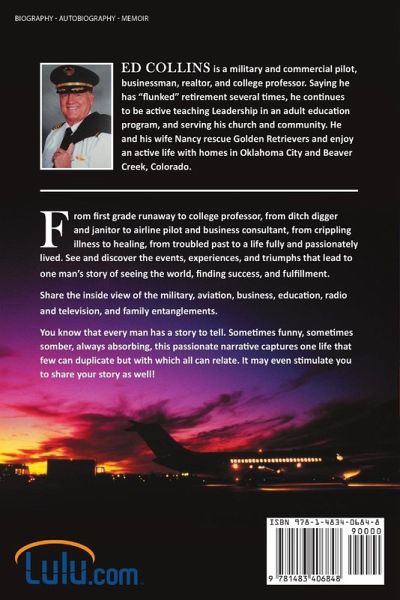 From first grade runaway to college professor, from ditch digger and janitor to airline pilot and business consultant, from crippling illness to healing, from troubled past to a life fully and passionately lived. See and discover the events, experiences, and triumphs that lead to one man's story of seeing the world, finding success, and fulfillment. Share the inside view of the military, aviation, business, education, radio and television, and family entanglements. You know that every man has a story to tell. Sometimes funny, sometimes somber, always absorbing, this passionate narrative captures one life that few can duplicate but with which all can relate. It may even stimulate you to share your story as well!