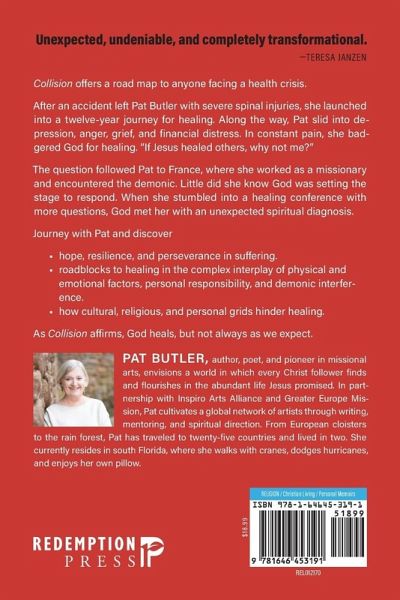 Unexpected, undeniable, and completely transformational. -Teresa Janzen Collision offers a road map to anyone facing a health crisis. After an accident left Pat Butler with severe spinal injuries, she launched into a twelve-year journey for healing. Along the way, Pat slid into depression, anger, grief, and financial distress. In constant pain, she badgered God for healing. "If Jesus healed others, why not me?" The question followed Pat to France, where she worked as a missionary and encountered the demonic. Little did she know God was setting the stage to respond. When she stumbled into a healing conference with more questions, God met her with an unexpected spiritual diagnosis. Journey with Pat as she discovers · hope, resilience, and perseverance in suffering. · roadblocks to healing in the complex interplay of physical and emotional factors, personal responsibility, and demonic interference. · how cultural, religious, and personal grids hinder healing. As Collision affirms, God heals, but not always as we expect. He's after transformation.