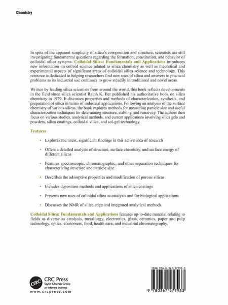 In spite of the apparent simplicity of silica's composition and structure, scientists are still investigating fundamental questions regarding the formation, constitution, and behavior of colloidal silica systems. Colloidal Silica: Fundamentals and Applications introduces new information on colloid science related to silica chemistry as well as theoretical and experimental aspects of significant areas of colloidal silica science and technology. This resource is dedicated to helping researchers find new uses of silica and answers to practical problems as its industrial use continues to grow steadily in traditional and novel areas. Written by leading silica scientists around the world, this book reflects developments in the field since silica scientist Ralph K. Iler published his authoritative book on silica chemistry in 1979. It discusses properties and methods of characterization, synthesis, and preparation of silica in terms of industrial applications. Following an analysis of the surface chemistry of various silicas, the book explores methods for measuring particle size and useful characterization techniques for determining structure, stability, and reactivity. The authors then focus on various studies, analytical methods, and current applications involving silica gels and powders, silica coatings, colloidal silica, and sol-gel technology. Colloidal Silica: Fundamentals and Applications features up-to-date material relating to fields as diverse as catalysis, metallurgy, electronics, glass, ceramics, paper and pulp technology, optics, elastomers, food, health care, and industrial chromatography. It is ideal for scientists interested in silica chemistry and physics as well as those not familiar with the subject.