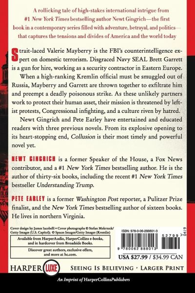 Now a National Bestseller! What if the Russians really are colluding with Americans...on the left? #1 New York Times bestselling author Newt Gingrich makes his return to political fiction with this rollicking tale of high-stakes international intrigue—the first book in a new, contemporary series, filled with adventure, betrayal, and politics—that captures the tensions and divides of America and the world today. Valerie Mayberry is the FBI’s counterintelligence expert on domestic terrorism. Brett Garrett is a dishonorably discharged ex-Navy SEAL, now a gun for hire, working as a security contractor in Eastern Europe. When a high ranking Kremlin official must be smuggled out of Russia, Mayberry and Garrett are thrown together to exfiltrate him and preempt a deadly poisonous strike. As these unlikely partners work to protect their human asset, their mission is threatened by domestic politics: leftist protests, congressional infighting, and a culture riven by hatred. Collusion raises many of the most significant issues facing America in real life today. How big a threat is Russia? Are American leftist activists susceptible to influence from abroad? How far will our enemies go to disrupt our politics and weaken the nation? Can we trust the media to differentiate between the good guys and the bad guys? Newt Gingrich and Pete Earley have entertained and educated readers with three previous works. From its explosive opening through several twists and turns to its heart-stopping end, Collusion is their most timely and powerful novel yet.