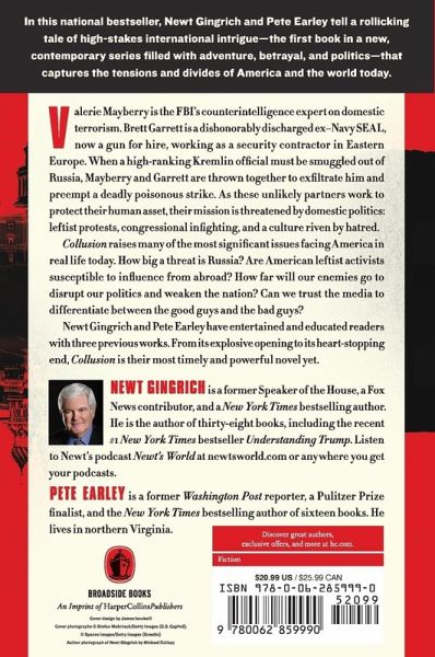 Now a National Bestseller! What if the Russians really are colluding with Americans...on the left? #1 New York Times bestselling author Newt Gingrich makes his return to political fiction with this rollicking tale of high-stakes international intrigue?the first book in a new, contemporary series, filled with adventure, betrayal, and politics?that captures the tensions and divides of America and the world today. Valerie Mayberry is the FBI's counterintelligence expert on domestic terrorism. Brett Garrett is a dishonorably discharged ex-Navy SEAL, now a gun for hire, working as a security contractor in Eastern Europe. When a high ranking Kremlin official must be smuggled out of Russia, Mayberry and Garrett are thrown together to exfiltrate him and preempt a deadly poisonous strike. As these unlikely partners work to protect their human asset, their mission is threatened by domestic politics: leftist protests, congressional infighting, and a culture riven by hatred. Collusion raises many of the most significant issues facing America in real life today. How big a threat is Russia? Are American leftist activists susceptible to influence from abroad? How far will our enemies go to disrupt our politics and weaken the nation? Can we trust the media to differentiate between the good guys and the bad guys? Newt Gingrich and Pete Earley have entertained and educated readers with three previous works. From its explosive opening through several twists and turns to its heart-stopping end, Collusion is their most timely and powerful novel yet.