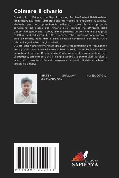 Questo libro, "Bridging the Gap: Enhancing Teacher-Student Relationships for Effective Learning" (Colmare il divario: migliorare le relazioni insegnante-studente per un apprendimento efficace), nasce da una profonda convinzione del potere trasformativo della connessione all'interno della classe. Attingendo alla ricerca, alle esperienze personali e alla saggezza collettiva degli educatori di tutto il mondo, offre un'esplorazione completa delle dinamiche, delle sfide e delle strategie necessarie per promuovere relazioni significative con gli studenti.Questo libro è una testimonianza della verità fondamentale che l'educazione non riguarda solo la trasmissione di informazioni, ma anche la coltivazione del potenziale umano. Dando la priorità allo sviluppo di relazioni autentiche e di sostegno, creiamo ambienti in cui gli studenti si sentono visti, ascoltati e valorizzati, consentendo loro di prosperare dal punto di vista accademico, sociale ed emotivo.