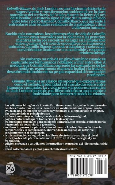 Colmillo Blanco, de Jack London, es una fascinante historia de supervivencia y transformación ambientada en la dura naturaleza del territorio del Yukón durante la fiebre del oro del Klondike. La historia sigue el viaje de un salvaje híbrido entre lobo y perro llamado Colmillo Blanco, que aprende a enfrentarse a las brutales realidades de la naturaleza y de la civilización humana. Nacido en la naturaleza, los primeros años de vida de Colmillo Blanco están marcados por la violencia y las penurias, mientras lucha por encontrar su lugar en el implacable entorno natural. A través de encuentros con humanos y animales, Colmillo Blanco aprende a adaptarse y sobrevivir, convirtiéndose finalmente en una temible y respetada criatura salvaje. Sin embargo, su vida da un giro dramático cuando es capturado por los humanos y obligado a vivir entre ellos. A medida que Colmillo Blanco aprende las costumbres de los hombres, experimenta el amor, la lealtad y la traición, descubriendo finalmente su propia capacidad de compasión y conexión. Colmillo Blanco es un clásico atemporal que explora temas como el instinto, la identidad y el vínculo duradero entre humanos y animales. La vívida prosa y la poderosa narrativa de Jack London hacen de este libro una lectura apasionante e inolvidable para lectores de todas las edades.