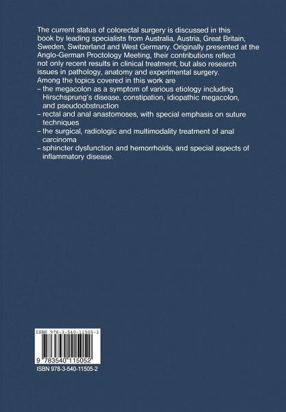 The Pathology of Megacolon.- Pathology of Hirschsprung's Disease and Ischaemic Colitis.- Surgery for Constipation.- Idiopathic Megacolon.- Hirschsprung's Disease.- Experience with Low Anterior Resection in Hirschsprung's Disease.- Complications After Surgical Treatment of Hirschsprung's Disease.- Pseudo-Obstruction of the Colon.- Acute Pseudo-Obstruction of the Large Bowel.- Toxic Megacolon.- Survival Prospects After Sphincter-Saving Operations.- Continent Ileostomy.- Indication for the Erlanger Magnetic Device.- Sphincteroplasty Using Autologous Smooth Muscle.- Experience of a New Hydraulic Sphincter Prothesis.- The Postanal Repair Operation in Unselected Patients with Idiopathic Faecal Incontinence.- Internal Sphincter Dysfunction: A Cause of Idiopathic Megacolon.- A Comparison of Infrared Coagulation and Conventional Methods in the Treatment of Haemorrhoids.- The Conservative Treatment of Haemorrhoidal Complaints.- Lord's Procedure for Haemorrhoids: A Prospective Anal Pressure Study.- Ileo-Anal Pouch Operation.- The Use of Circular Staplers for the Construction of Colorectal Anastomoses After Anterior Resection.- Stapler Anastomoses in the Low Rectal Third.- Comparative Results of Hand and Mechanical Suture in Low Colorectal Anastomosis.- Low Anterior Resection.- Bowel Preparation Using Antimicrobial Measures.- Functional Results After Low Anterior Resection.- Colorectal Anastomosis: Factors Influencing Success.- Surgery for Anal Carcinoma.- Combined Therapy for Anal Carcinoma.- Radiotherapy for Anal Carcinoma.- Multimodality Approach in Therapy of Anal Carcinoma.- "A Disease Revived" - Ileocaecal Tuberculosis.- Ischaemic Proctitis.- The Course and Prognosis of Idiopathic Distal Proctocolitis.- Management of the Solitary Rectal Ulcer Syndrome.-Assessment and Management of Fistulae in Crohn's Disease.
