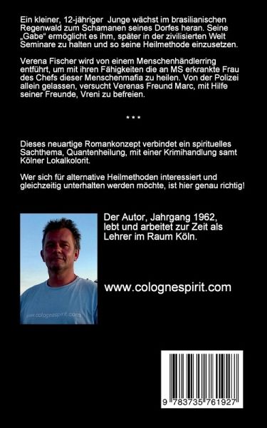Ein kleiner, 12-jähriger Junge, wächst im brasilianischen Regenwald zum Schamanen seines Dorfes heran. Seine "Gabe" ermöglicht es ihm, später, in der zivilisierten Welt, Seminare zu halten und so seine Heilmethode einzusetzen.Verena Fischer wird von einem Menschenhändlerring entführt, um mit ihren Fähigkeiten die an MS erkrankte Frau des Chefs dieser Menschenmafia zu heilen. Von der Polizei allein gelassen, versucht Verenas Freund Marc, mit Hilfe seiner Freunde, Vreni zu befreien.Dieses neuartige Romankonzept verbindet ein spirituelles Sachthema, Quantenheilung, mit einer Krimihandlung und einer Prise Kölner Lokalkolorit. Wer sich für alternative Heilmethoden interessiert und gleichzeitig unterhalten werden möchte, ist hier genau richtig!