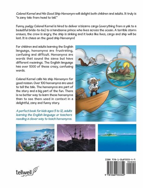 Colonel Kernel and His Good Ship Homonym will delight both children and adults. It truly is "a zany tale from head to tail." Funny, pudgy Colonel Kernel is hired to deliver a bizarre cargo (everything from a yak to a beautiful bride-to-be) to a handsome prince who lives across the ocean. A terrible storm ensues, the crew is angry, the ship is sinking and it looks like lives, cargo and ship will be lost. It is chaos on the good ship Homonym! For children and adults learning the English language, homonyms are frustrating, confusing and difficult. Homonyms are words that sound the same but have…mehr