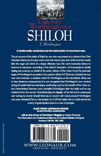 A battle badly conducted and the destruction of one brave man This an account of the battle of Shiloh by one who was present as a colonel of the Ohio Volunteer infantry, but it is also much more than that. In every line of this book the reader feels the anger and vitriol of a deeply offended man. This work transcends history to become an exposure-according to the author's viewpoint-of incompetence, double dealing and cover-up on behalf of the senior officers of the Union Army. The particular target of Worthington's accusation is his superior officer W. T. Sherman. Certainly the two men were enemies-a situation which for Worthington, as the subordinate officer, was to have disastrous consequences. It is now recognised that Worthington's own conduct during the battle itself was exemplary, contributing much to the benefit of the Union action. Nevertheless, Sherman court martialled Worthington after the battle and he was cashiered from the service. Notwithstanding the illegality of his trial and its subsequent over turning by Lincoln himself, Sherman, in concert with Grant, ensured Worthington was never reinstated. This is a vital analysis of a Civil War battle with no holds barred and a story of great injustice done to a man of principle.