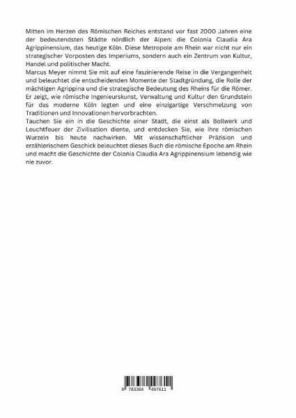Mitten im Herzen des Römischen Reiches entstand vor fast 2000 Jahren eine der bedeutendsten Städte nördlich der Alpen: die Colonia Claudia Ara Agrippinensium, das heutige Köln. Diese Metropole am Rhein war nicht nur ein strategischer Vorposten des Imperiums, sondern auch ein Zentrum von Kultur, Handel und politischer Macht.Marcus Meyer nimmt Sie mit auf eine faszinierende Reise in die Vergangenheit und beleuchtet die entscheidenden Momente der Stadtgründung, die Rolle der mächtigen Agrippina und die strategische Bedeutung des Rheins für die Römer. Er zeigt, wie römische Ingenieurskunst, Verwaltung und Kultur den Grundstein für das moderne Köln legten und eine einzigartige Verschmelzung von Traditionen und Innovationen hervorbrachten.Tauchen Sie ein in die Geschichte einer Stadt, die einst als Bollwerk und Leuchtfeuer der Zivilisation diente, und entdecken Sie, wie ihre römischen Wurzeln bis heute nachwirken. Mit wissenschaftlicher Präzision und erzählerischem Geschick beleuchtet dieses Buch die römische Epoche am Rhein und macht die Geschichte der Colonia Claudia Ara Agrippinensium lebendig wie nie zuvor.