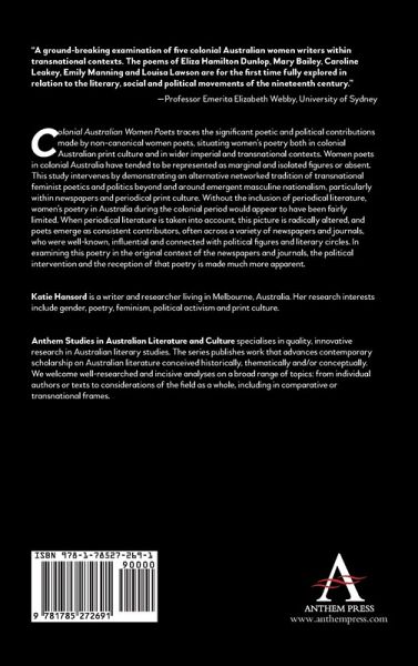 This book considers the political and feminist significance of non-canonical women poets, particularly those who were writing in newspapers and periodicals, in colonial Australia.