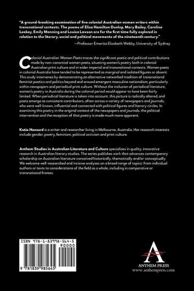 This book considers the political and feminist significance of non-canonical women poets, particularly those who were writing in newspapers and periodicals, in colonial Australia.