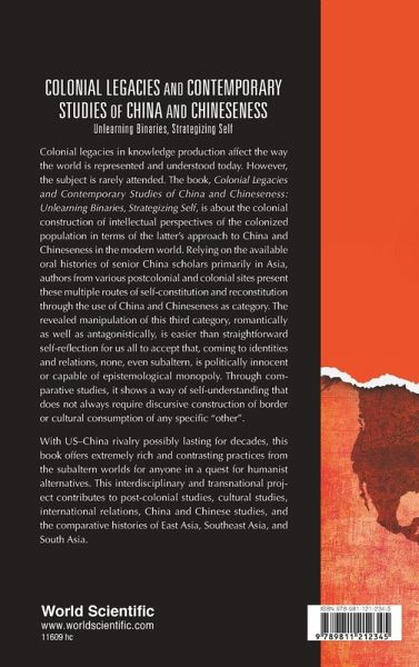 Colonial legacies in knowledge production affect the way the world is represented and understood today. However, the subject is rarely attended. The book, Colonial Legacies and Contemporary Studies of China and Chineseness: Unlearning Binaries, Strategizing Self, is about the colonial construction of intellectual perspectives of the colonized population in terms of the latter's approach to China and Chineseness in the modern world. Relying on the available oral histories of senior China scholars primarily in Asia, authors from various postcolonial and colonial sites present these multiple routs of self-constitution and reconstitution through the use of China and Chineseness as category. The revealed manipulation of this third category, romantically as well as antagonistically, is easier than straightforward self-reflection for us all to accept that, coming to identities and relations, none, even subaltern, is politically innocent or capable of epistemological monopoly. Through comparative studies, it shows a way of self-understanding that does not always require discursive construction of border or cultural consumption of any specific "other". With US–China rivalry possibly lasting for decades, this book offers extremely rich and contrasting practices from the subaltern worlds for anyone in a quest for humanist alternatives. This interdisciplinary and transnational project contributes to post-colonial studies, cultural studies, international relations, China and Chinese studies, and the comparative histories of East Asia, Southeast Asia, and South Asia.