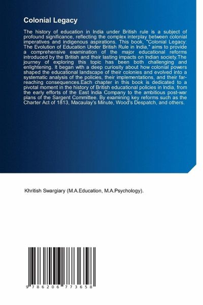 The history of education in India under British rule is a subject of profound significance, reflecting the complex interplay between colonial imperatives and indigenous aspirations. This book, "Colonial Legacy: The Evolution of Education Under British Rule in India," aims to provide a comprehensive examination of the major educational reforms introduced by the British and their lasting impacts on Indian society.The journey of exploring this topic has been both challenging and enlightening. It began with a deep curiosity about how colonial powers shaped the educational landscape of their colonies and evolved into a systematic analysis of the policies, their implementations, and their far-reaching consequences.Each chapter in this book is dedicated to a pivotal moment in the history of British educational policies in India, from the early efforts of the East India Company to the ambitious post-war plans of the Sargent Committee. By examining key reforms such as the Charter Act of 1813, Macaulay's Minute, Wood's Despatch, and others.