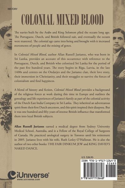 COLONIAL MIXED BLOOD The navies built by the Arabs and King Solomon plied the oceans long ago. The Portuguese, Dutch, and British followed suit, and eventually the oceans were mastered. The colonial age came into being and brought with it increased movements of people and the mixing of genes. In Colonial Mixed Blood, author Allan Russell Juriansz, who was born in Sri Lanka, provides an account of this occurrence with reference to the Portuguese, Dutch, and British who colonized Sri Lanka for the period of the past five hundred years. The story begins in Riga, Latvia, in the late 1400s and centres on the Ondatjes and the Juriansz clan, their love story, their immersion in Christianity, and their struggles to survive the forces of colonialism and find happiness. A blend of history and fiction, Colonial Mixed Blood provides a background of the religious forces at work during this time in Europe and outlines the genealogy and life experiences of Juriansz’s family as part of the colonial activity of the Dutch East India Company in Sri Lanka. They inherited an adventurous spirit from their first Dutch ancestors, and this spirit inspired their diaspora. But it was one hundred and fifty years of intense British influence that transformed them into loyal British subjects.