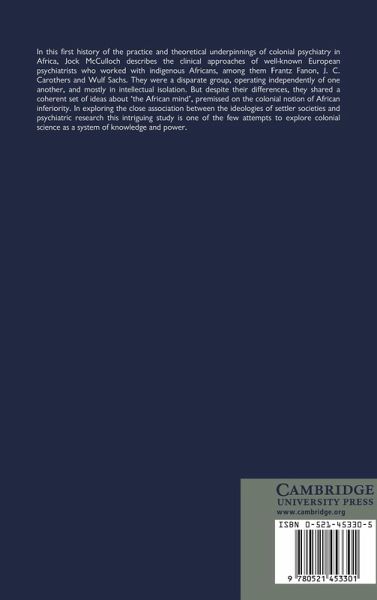 In this first history of the practice and the theoretical underpinnings of colonial psychiatry in Africa, Jock McCulloch describes the clinical approaches of well-known European psychiatrists who worked with indigenous Africans, among them Frantz Fanon, J. C. Carothers and Wulf Sachs. They were a disparate group, operating independently of one another, and mostly in intellectual isolation. But despite their differences, they shared a coherent set of ideas about 'the African mind', premissed on the colonial notion of African inferiority. In exploring the close association between the ideologies of settler societies and psychiatric research this intriguing study is one of the few attempts to explore colonial science as a system of knowledge and power.
