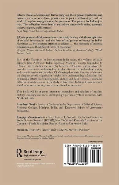 Introduction. Part I: Framework, Administration and Democratisation 1. Cast of Colonialism: Constructing the Peculiar North East India Arambam Noni 2. Colonial Administration, Knowledge and Intervention: Colonial Project of Ethnicisation in Manipur Homen Thangjam 3. Revisiting the Kuki Rebellion and Nupi Lan Lisham Henthoiba 4. Colonialism and Movement of Democracy in Manipur Konthoujam Indrakumar Part II: Literature, Popular Culture and Religion 5. Religious Revivalism and Colonial Rule: Origin of the Sanamahi movement Khuraijam Bijoykumar Singh 6. Politics, Society and Literature in Modern Manipur Arambam Noni 7. Desire, Disgrace and Colonialism: A Reading of Bor Sahib Ongbi Sanatombi Rajkumari Smejita 8. Jesters of Popular Genres as an Agent of Resistance through Reflexivity Ksh. Imokanta Singh Part III: Imperial Strategies and Distinct Political Histories 9. Situating Manipur in the Geopolitics of Imperial Powers Laishram Churchil 10. Consolidation of British 'Indirect Rule' in Manipur Naorem Malemsanba Meetei 11. Interrogating into the Political Status of Manipur Kangujam Sanatomba 12. Christian Missionaries and Colonialism in the Hills of Manipur Lianboi Vaiphei Part IV: Post-Empire Manipur, Organisational Politics and Frontier 13. Organisational Politics in 20th Century Manipur: Trajectories and Footprints Arambam Noni 14. Polemics of the Manipur Merger Agreement, 1949 Kangujam Sanatomba 15. Centrality of Body Politics in Thockchand's Script and Cultural Revivalism in Manipur Naorem Malemsanba Meetei 16. Recasting Space: Politics of Frontier Making Thingnam Sanjeev. Bibliography