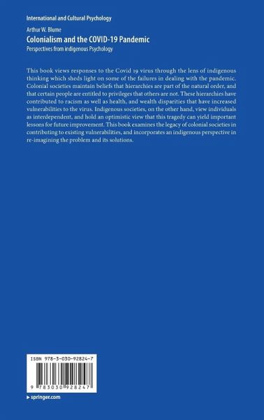 Chapter 1. Colonialism and Pandemics.- Chapter 2. The Colonial War with the Environment.- Chapter 3. The Colonial Economics of COVID-19.- Chapter 4. Colonial -isms and COVID-19.- Chapter 5. Colonialism, COVID-19, and Education.- Chapter 6. Health Disparities and COVID-19.- Chapter 7. Colonialism, Treatments, and Vaccinations.- Chapter 8. Colonial Suffrage.- Chapter 9. Colonial Privilege and COVID-19.- Chapter 10. COVID-19 Created Opportunities.- Chapter 11. Indigenous Psychology and the Next Pandemic.