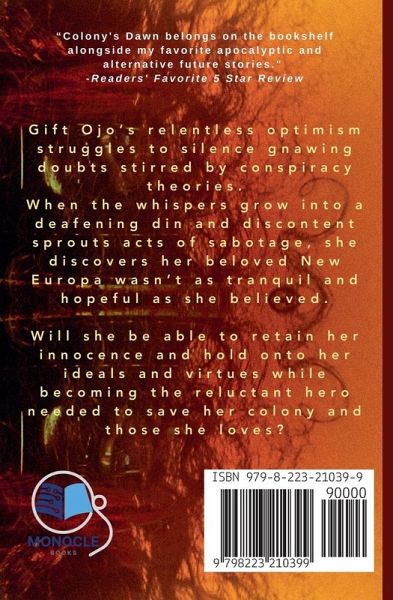 Best Science Fiction audiobook of 2023 - Readers' Favorite 5 Star Seal Today's billionaires (you know the ones) are building spaceships and are convinced our future must be made on Mars. Colony's Dawn imagines life in a sealed colony after a couple of centuries where no one had ever stepped outside or seen the sky. Not everyone is content to fill their role for future generations to enjoy the fruits of their labor. Gift Ojo's relentless optimism struggles to silence gnawing doubts stirred by conspiracy theories. When the whispers grow into a deafening din and discontent sprouts acts of sabotage, she discovers her beloved New Europa wasn't as tranquil as she believed. Will she be able to retain her innocence and hold onto her ideals and virtues while becoming the reluctant hero needed to save her colony and those she loves? "A great story and the universe the author has created is fascinating." -goodreads.com