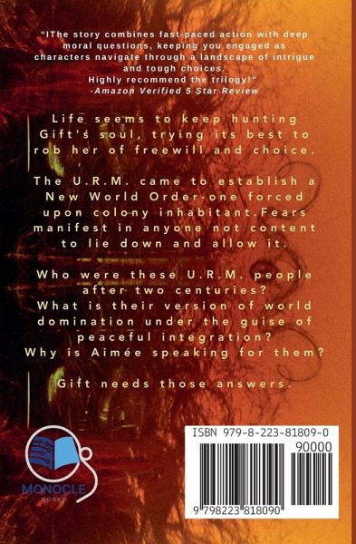 Beyond the glorious exploration of the wondrous outdoors and meeting new peoples, life seemed to keep hunting Gift's very soul, trying its best to rob her of freewill and choice. The arrival of the U.R.M. was shocking. That they had come to establish a New World Order forced upon colony inhabitants created a knot in the stomachs of Gift, her friends, and former enemies. Questions manifest as fear in anyone not content to lie down and allow it. Who were these U.R.M. people after two centuries? What is their version of world domination under the guise of peaceful integration? Why is Aimée speaking for them? Gift needs those answers.