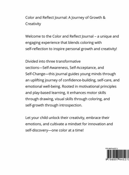Color and Reflect Journal: A Creative Journey of Growth & Discovery Welcome to the Color and Reflect Journal-a unique and engaging experience designed to nurture well-being through the perfect blend of coloring and self-reflection. Divided into three enriching sections-Self-Awareness, Self-Acceptance, and Self-Change-this journal guides children through essential aspects of personal growth while fostering creativity and mindfulness. Designed to: ✅ Enhance motor skills through drawing ✅ Refine visual skills with coloring ✅ Foster self-growth through introspection This play-based learning experience inspires confidence, creativity, and emotional well-being, preparing children for a future of innovation and self-care. Let's begin this vibrant adventure together!