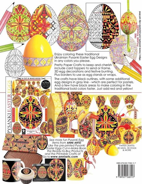 Pretty paper crafts for Easter to color, cherish and display year after year. Make art cards to frame or send, festive bunting, 3D Easter egg decorations and egg wraps for heirloom keepsakes. Color the Pysanki egg designs in any choice of colors or use the traditional, bold folk colors of red, yellow and black. The crafts are in black and white line, with some additional card toppers in gray line and a few have pre-filled black areas. The designs in gray line are perfect for coloring in light pastel colors, while the toppers with black details are for quick coloring in the traditional folk colors. Just add yellow and black. There is also a coordinating Anni Arts Pysanki Easter Eggs Cut-n-Make Book, printable Easter crafts and ready-to-buy products that feature beautiful Pysanki eggs in the rich folk colors.