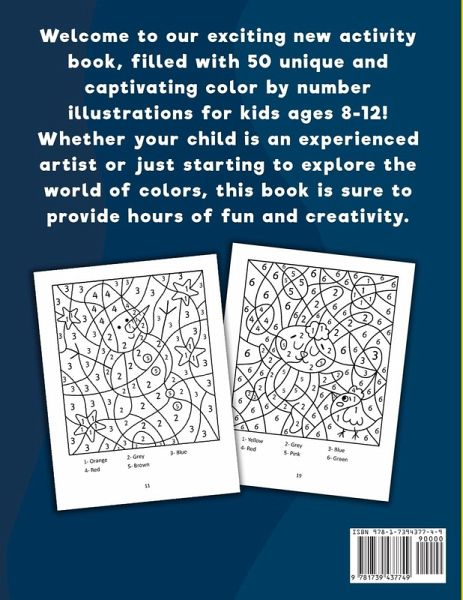 Introducing the perfect creative outlet for kids ages 8-12 - our Color by Numbers Book! This engaging activity book offers a fun and exciting way for kids to express themselves while improving their focus and motor skills. With 50 unique designs to choose from, each page offers a new and exciting challenge. The pages are filled with bold and detailed designs, perfect for keeping young minds engaged and entertained for hours on end. Each design is accompanied by a color key, making it easy for kids to match the numbered areas with the correct colors. This not only helps children develop their color recognition skills, but also encourages them to follow instructions and think critically. Whether your child is looking for a quiet afternoon activity or a fun way to unwind after a long day, our Color by Numbers Book is the perfect choice. With its vibrant designs and easy-to-follow instructions, it's sure to become a favorite in any young artist's collection. 50 Unique Designs - Spend plenty of time away from a screen, engaged in connecting the dots in the puzzles. Keeps you child's mind active and productive. Each design is printed on a single side. Presented on 8.5inch x 11inch pages. Perfect to use with coloring pencils, crayons, markers, felt tip pens, and watercolor paints. Encourage Skill Building - Helps kids improve their fine motor and concentration skills. A great choice for a kid's color/colour by numbers book, that will encourage kids to be creative, focus on a task, and teach them to finish what they have started. A great alternative to keeping kids away from the screen. Perfect to Give as a Gift - Treat any child with this color by numbers book, whether it be for Christmas, Easter, Birthdays, Summer or any other holidays, Halloween, Road / Travel Trips, and any other occasion. Specifications:50 unique color by numbers designs 8.5inch x 11inch / 21.6cm x 28cm sized pages Glossy finish cover for an elegant look and feel
