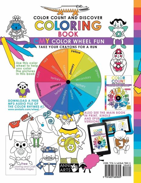 Take your crayons for a run! This Color Count and Discover coloring book is a perfect side-by-side companion to the main Color Count and Discover lesson book in print or epub - but it can also be a stand-alone coloring book. The main book and the coordinating coloring book make a super gift pair. All fourteen whacky characters from the Color Count and Discover CMY lesson book are assembled here to color - alongside color wheels for some extra color lesson fun. The CMY color system - with Cyan Magenta and Yellow as primary colors - can be used in a fun and practical way - or children can simply choose their own colors and disregard the lesson component. The CMY system is a good color system to teach to young children, as it is used extensively in our modern world of commercial printing, paint mixes and inks for desktop printers. There are additional fun products and teaching materials - like posters and art aprons - that feature the little characters in the rhymes. All make great gifts and learning aids.