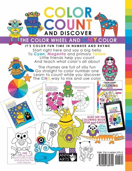 Learn to count and learn about color. The CMY color system - with Cyan Magenta and Yellow as primary colors - is taught in fun color lessons in the form of silly counting rhymes and bold full-color illustrations. There are different editions for US or UK/International English. Wacky friends help you count And teach what color’s all about It's color fun time In number and rhyme Little characters - from one arty mouse to twelve smiling crocs - take children around the color wheel. Bear and bug rhymes further explain the colors brown and black, and additional rhymes explain shades, tints, tones, hue and the names for colors. Small children will enjoy listening to the color rhymes, early readers will enjoy reading them, and teachers and parents can refer to the color theory rhymes to explain the system to young children. Each rhyme is also repeated in a plain prose sentence. There is a matching coloring book too, as well as free coloring and craft activity downloads and a MP3 audio file. The addition of the coloring book makes a perfect side-by-side pair with either the print or digital main book. There are Kindle versions too: as a teacher's textbook and an abridged children's version. The CMY system is a good color system to teach to young children, as it is used extensively in our modern world of commercial printing, paint mixes and inks for desktop printers. Indie authors too, have had to come to grips with it! The quality of color printing we enjoy today, came about with the introduction of the CMYK system. Black was added to give depth to CMY color images (it is indicated by the letter K as can be seen in print cartridges). Color theory is a fascinating part of both the art and science worlds. Famous artists, philosophers and scientists ranging from Goethe to Mansell, and Da Vinci to Newton have all grappled with the qualities of color and light. There are additional Anni Arts products and teaching materials, like posters and art aprons, that feature the little characters in the rhymes. All make great gifts and learning aids.