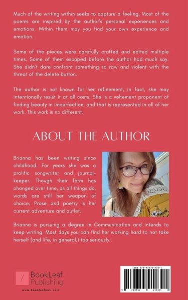 ""Much of the writing within seeks to capture a feeling. Most of the poems are inspired by the author's personal experiences and emotions. Within them may you find your own experience and emotion. Some of the pieces were carefully crafted and edited multiple times. Some of them escaped before the author had much say. She didn't dare confront something so raw and violent with the threat of the delete button. The author is not known for her refinement, in fact, she may intentionally resist it at all costs. She is a vehement proponent of finding beauty in imperfection, and that is represented in all of her work. This work is no different.""