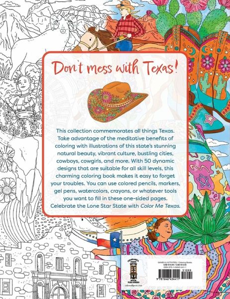 Unwind and express your creativity with the iconic designs in Color Me Texas. Don't mess with Texas! This collection celebrates all iconic things about Texas. These detailed illustrations allow you to practice mindfulness and will keep you busy for hours. Take advantage of the meditative benefits of coloring with cowboys, BBQ, Cadillac Ranch, the Alamo, Guadalupe Mountains National Park, the Fort Worth Stockyards, football, and more. Color Me Texas includes: * 50 coloring pages designed to help you unwind * Designs suitable for all skill levels, with a range of selections for beginners and experienced artists * One-sided pages so your art doesn't bleed through to the other side * Anxiety-reducing benefits to lift your mood and help you practice mindfulness Whether you need a calming atmosphere, want to unwind at the end of the day, are trying a new hobby, or just love coloring, there is something here for everyone. Forget your worries as you explore these creative scenes. You can use colored pencils, markers, gel pens, watercolors, crayons, or whatever tool you want to fill in these designs. Embrace your state pride with Color Me Texas.