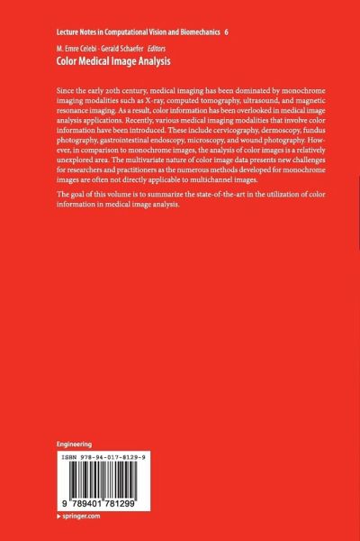 Since the early 20th century, medical imaging has been dominated by monochrome imaging modalities such as x-ray, computed tomography, ultrasound, and magnetic resonance imaging. As a result, color information has been overlooked in medical image analysis applications. Recently, various medical imaging modalities that involve color information have been introduced. These include cervicography, dermoscopy, fundus photography, gastrointestinal endoscopy, microscopy, and wound photography. However, in comparison to monochrome images, the analysis of color images is a relatively unexplored area.…mehr