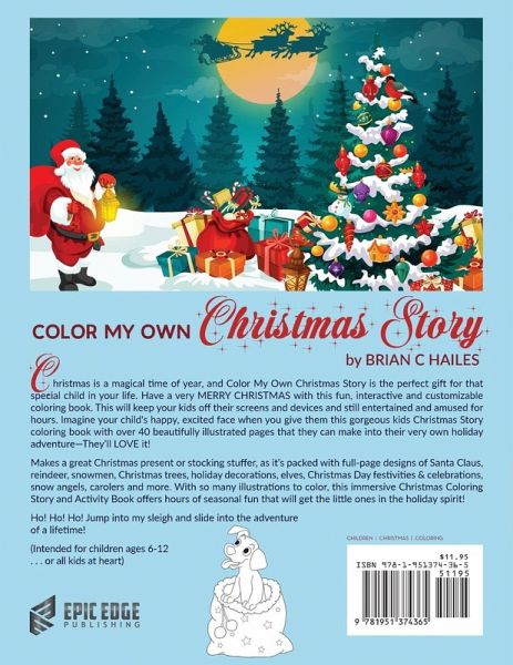 Christmas is a magical time of year, and Color My Own Christmas Story is the perfect Christmas gift or present for that special child in your life. Have a very MERRY CHRISTMAS with this fun, interactive and customizable coloring book. This will keep your kids off their screens and devices and still entertained and amused for hours. Imagine your child's happy, excited face when you give them this gorgeous kids Christmas Story coloring book with over 40 beautifully illustrated pages that they can make into their very own holiday adventure-They'll LOVE it! Makes a great Christmas gift or stocking stuffer, as it's packed with full-page designs of Santa Claus, reindeer, snowmen, Christmas trees, holiday decorations, elves, Christmas Day festivities & celebrations, the nativity, carolers and more. With so many illustrations to color, this immersive Christmas Coloring Story and Activity Book offers hours of seasonal fun that will get the little ones in the holiday spirit! We have purposefully avoided overly intricate designs as well as overly simplistic ones for children 6-12, for coloring fun that will fire up their imaginations-it's not just a book full of simple shapes. The pages are also a nice, large 8.5x11 inch size. Ho! Ho! Ho! Jump into my sleigh and slide into the adventure of a lifetime!