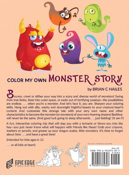 Bounce, crawl or slither your way into a scary and diverse world of monsters! Swing from tree limbs, blast into outer space, or swim out of terrifying swamps-the possibilities are endless . . . when you're a monster. And let's face it, you are. Sharpen your coloring skills. Hang out with silly, wacky and downright frightful beasts to your creature heart's content. And customize this strange tale with your very own name and other characteristics to become the monster (or monsters) of your own rhyming dreams! Bedtime will never be the same. (And good luck going to sleep afterwards . . . just kidding! Or am I?) A fun, interactive coloring trip that will slap you with a tentacle or throw you into the hay-you just never know what will happen with friends like these! Grab your crayons, markers or pencils, and grease up your dragon scales, little monsters. It's time to forget about time . . . and have a great time! We have purposefully avoided overly intricate designs as well as overly simplistic ones for children 6-12, for coloring fun that will fire up their imaginations-it's not just a book full of simple shapes. The pages are also a nice, large 8.5x11 inch size. (Intended for children ages 6-12 . . . or all kids at heart)