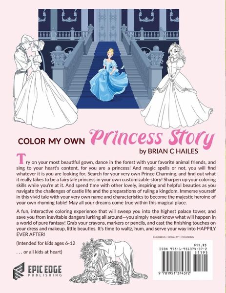 Try on your most beautiful gown, dance in the forest with your favorite animal friends, and sing to your heart's content, for you are a princess! And magic spells or not, you will find whatever it is you are looking for. Search for your very own Prince Charming, and find out what it really takes to be a fairytale princess in your own customizable story! Sharpen up your coloring skills while you're at it. And spend time with other lovely, inspiring and helpful beauties as you navigate the challenges of castle life and the preparations of ruling a kingdom. Immerse yourself in this vivid tale with your very own name and characteristics to become the majestic heroine of your own rhyming fable! May all your dreams come true within this magical place. A fun, interactive coloring experience that will sweep you into the highest palace tower, and save you from inevitable dangers lurking all around-you simply never know what will happen in a world of pure fantasy! Grab your crayons, markers or pencils, and cast the finishing touches on your dress and makeup, little beauties. It's time to waltz, hum, and serve your way into HAPPILY EVER AFTER! ¿(We have purposefully avoided overly intricate designs as well as overly simplistic ones for children 6-12, for coloring fun that will fire up their imaginations-it's not just a book full of simple shapes. The pages are also a nice, large 8.5x11 inch size)