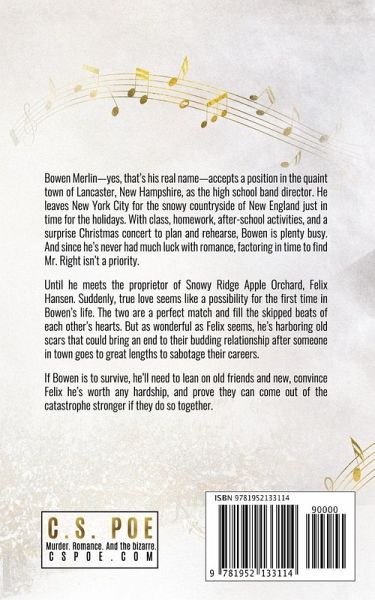 Bowen Merlin-yes, that's his real name-accepts a position in the quaint town of Lancaster, New Hampshire, as the high school band director. He leaves New York City for the snowy countryside of New England just in time for the holidays. With class, homework, after-school activities, and a surprise Christmas concert to plan and rehearse, Bowen is plenty busy. And since he's never had much luck with romance, factoring in time to find Mr. Right isn't a priority. Until he meets the proprietor of Snowy Ridge Apple Orchard, Felix Hansen. Suddenly, true love seems like a possibility for the first time in Bowen's life. The two are a perfect match and fill the skipped beats of each other's hearts. But as wonderful as Felix seems, he's harboring old scars that could bring an end to their budding relationship after someone in town goes to great lengths to sabotage their careers. If Bowen is to survive, he'll need to lean on old friends and new, convince Felix he's worth any hardship, and prove they can come out of the catastrophe stronger if they do so together.