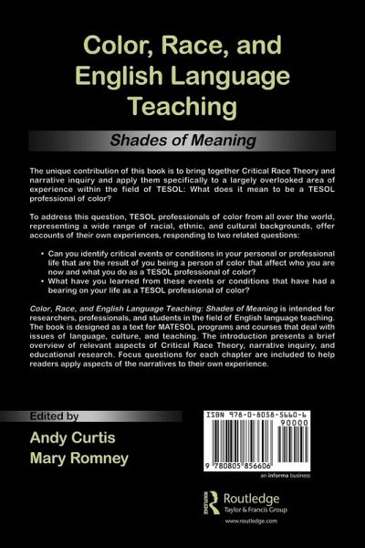 This volume addresses the question, What does it mean to be a TESOL professional of color? Thirteen narratives by TESOL professionals of color are prefaced by an introduction and overview of critical race theory, narrative inquiry, and educational resear