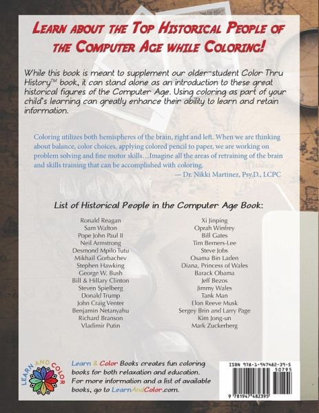 LEARN ABOUT THE TOP HISTORICAL PEOPLE OF THE COMPUTER AGE WHILE COLORING! While this book is meant to supplement our older-student Color Thru History book, it can stand alone as an introduction to these great historical figures of the Computer Age. Using coloring as part of your child's learning can greatly enhance their ability to learn and retain information. "Coloring utilizes both hemispheres of the brain, right and left. When we are thinking about balance, color choices, applying colored pencil to paper, we are working on problem solving and fine motor skills...Imagine all the areas of retraining of the brain and skills training that can be accomplished with coloring." - Dr. Nikki Martinez, Psy.D., LCPC