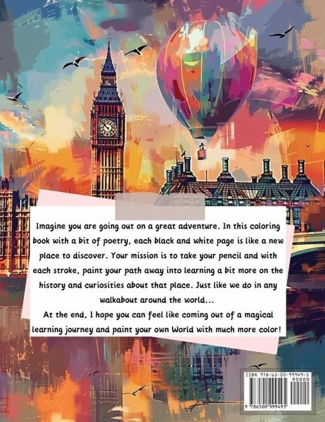 Color Travels: Around the World in 80 colorings is a color book with a "pencil touch" of poetry that will transport you to the most fantastic places of today and tomorrow. Imagine you are going out in a great adventure. In this coloring book with a bit of poetry, each black and white page is like a new place to discover. Your mission is to take your pencil and with each stroke, paint your path away into learning a bit more on the history and curiosities about that place. Just like we do on any walkabout around the world... At the end, I hope you can feel like coming out of a magical learning journey and paint your own World with much more color!