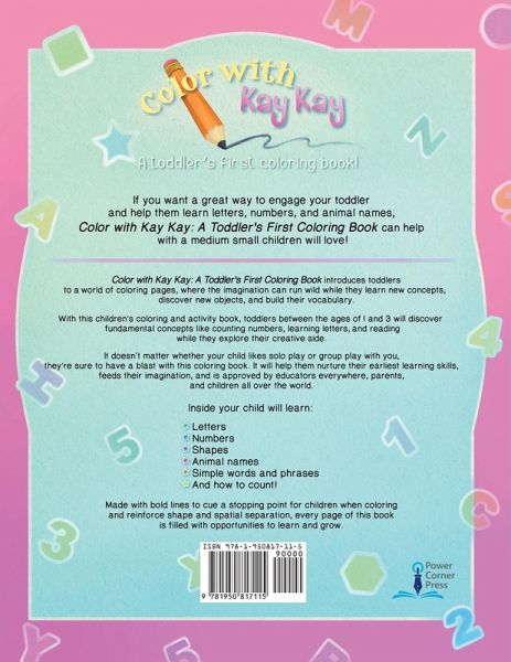 Color with Kay Kay: A Toddler's First Coloring Book introduces toddlers to a world of coloring pages, where the imagination can run wild while they learn new concepts, discover new objects, and build their vocabulary. With this children's coloring and activity book, toddlers between the ages of 1 and 3 will discover fundamental concepts like counting numbers, learning letters, and reading while they explore their creative side. It doesn't matter whether your child likes solo play or group play with you, they're sure to have a blast with this coloring book. It will help them nurture their earliest learning skills, feeds their imagination, and is approved by educators everywhere, parents, and children all over the world. Inside your child will learn: ¿ Letters ¿ Numbers ¿ Shapes ¿ Animal names ¿ Simple words and phrases ¿ And how to count! Made with bold lines to cue a stopping point for children when coloring and reinforce shape and spatial separation, every page of this book is filled with opportunities to learn and grow.