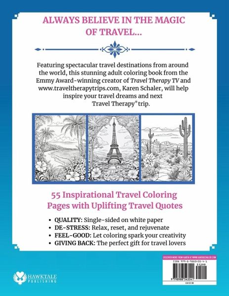 Color Your Travel Dreams, created by Emmy Award-winning travel expert and TV host Karen Schaler, is a relaxing, calming, and mindful travel coloring book for adults featuring dream destinations from around the world, with beautiful bold coloring pages and inspiring quotes. "Beautiful, travel-inspired adult coloring book!" -Melissa's Bookshelf This unique adult travel coloring book includes stress-relieving coloring pages that take you from sun-kissed Caribbean beaches and tropical islands to enchanting forests, majestic mountains, mystical deserts, gorgeous gardens, cozy winter wonderlands, scenic vineyards, and more. A perfect gift for women and teens for birthdays, Christmas, Valentine's Day, Mother's Day, and all special occasions. "Best coloring book if you love to travel." -RV Traveler 119 Pages of Beautiful Coloring Book Pages Paired with Inspirational Quotes QUALITY: Single-sided on white paper, no-bleed coloring book RELAXING COLORING BOOK: A soothing and calming adult coloring experience MINDFUL COLORING PAGES: Relax, reset, and rejuvenate with this travel-themed coloring book COLORING BOOK THERAPY: Let these travel-inspired pages and quotes spark your creativity PERFECT GIFT: The perfect coloring book gift for travel lovers Karen Schaler, the host of Travel Therapy TV, created this one-of-a-kind travel coloring book to help you de-stress and reconnect with peace, creativity, and inspiration. ALSO AVAILABLE Love the holidays? Try Color Your Christmas Dreams, the best adult coloring book Christmas gift inspired by Karen's Christmas novels and movies for Netflix, Hallmark, and Lifetime. All of Karen's adult coloring books make thoughtful gifts for anyone who loves to color, travel, and feel inspired.