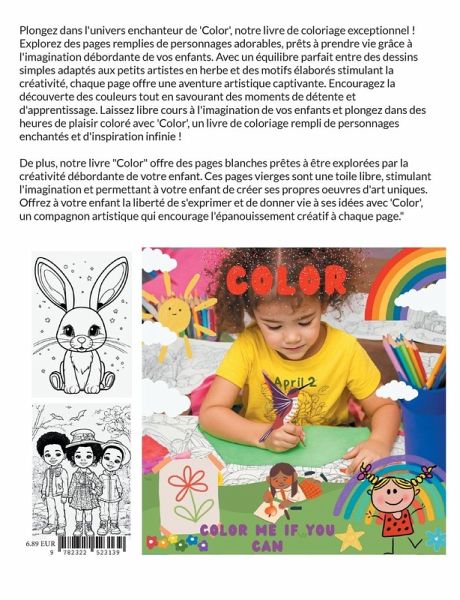 Plongez dans l'univers enchanteur de 'Color', notre livre de coloriage exceptionnel ! Explorez des pages remplies de personnages adorables, prêts à prendre vie grâce à l'imagination débordante de vos enfants. Avec un équilibre parfait entre des dessins simples adaptés aux petits artistes en herbe et des motifs élaborés stimulant la créativité, chaque page offre une aventure artistique captivante. Encouragez la découverte des couleurs tout en savourant des moments de détente et d'apprentissage. Laissez libre cours à l'imagination de vos enfants et plongez dans des heures de plaisir coloré avec 'Color', un livre de coloriage rempli de personnages enchantés et d'inspiration infinie !De plus, notre livre "Color" offre des pages blanches prêtes à être explorées par la créativité débordante de votre enfant. Ces pages vierges sont une toile libre, stimulant l'imagination et permettant à votre enfant de créer ses propres oeuvres d'art uniques. Offrez à votre enfant la liberté de s'exprimer et de donner vie à ses idées avec 'Color', un compagnon artistique qui encourage l'épanouissement créatif à chaque page."