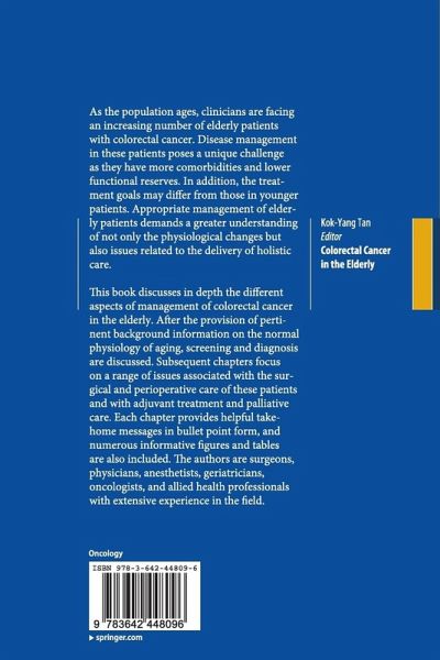 As the population ages, clinicians are facing an increasing number of elderly patients with colorectal cancer. These patients pose unique challenges as they have more comorbidities and lower functional reserves. In addition, the treatment goals may differ from those in younger patients. This book discusses in depth the different aspects of management of colorectal cancer in the elderly. After the provision of pertinent background information on the normal physiology of aging, screening and diagnosis are discussed. Subsequent chapters focus on a range of issues associated with the surgical and perioperative care of these patients and with adjuvant treatment and palliative care. Each chapter provides helpful take-home messages in bullet point form, and numerous informative figures and tables are also included. The authors are surgeons, physicians, anesthetists, geriatricians, oncologists, and allied health professionals with extensive experience in the field.