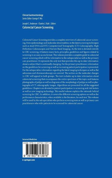 Chapters are devoted to patient participation in screening and risk factors as well as new imaging technology. This useful volume explains the rationale behind screening for CRC. In addition, it covers the different screening options as well as the performance characteristics, when available in the literature, for each test. This volume will be used by the sub specialists who perform screening tests as well as primary care practitioners who refer patients to be screened for colorectal cancer.