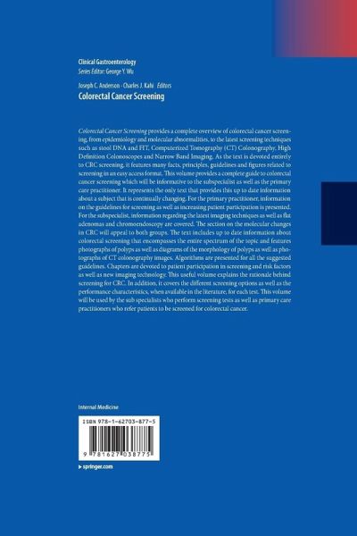 Chapters are devoted to patient participation in screening and risk factors as well as new imaging technology. This useful volume explains the rationale behind screening for CRC. In addition, it covers the different screening options as well as the performance characteristics, when available in the literature, for each test. This volume will be used by the sub specialists who perform screening tests as well as primary care practitioners who refer patients to be screened for colorectal cancer.
