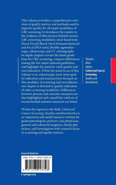 History and Overview of the National Quality Strategy.- Current Screening and Surveillance Guidelines.- Comparative and Cost Effectiveness of Current CRC Screening Modalities.- Quality Indicators and Benchmarks For Guideline Recommended Fecal Occult Blood Tests (FOBT).- Quality Indicators for CT Colonography (CTC).- Stool DNA for Colorectal Cancer Screening: From Concepts to Quality Care.- Quality Indicators for Colonoscopy.- Toward a Learning Healthcare System: Use of Colorectal Cancer Quality Measures for Physician Evaluation.- Sedation Issues in Colonoscopy: Quality and Economic Considerations.- Role of Pathology in Quality of Colonoscopy.- Managing Quality in Ancillary Services.- Medical Legal Aspects of Quality Improvement.- Areas for Future Research.