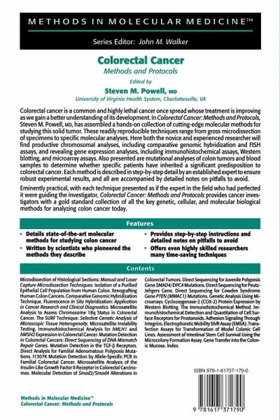 "This is quite interesting and a valuable volume. It aims to instruct investigators in the key genetic, cellular and molecular biological methods for analyzing colorectal tumors. It's quite precise in its description of these techniques and, as the preface says, "The focused techniques and assays are described in sufficient detail to allow researchers to start an experiment on colon tumors and proceed from beginning to end as if the expert in the field who has performed these studies were guiding them at the bench." A large amount of practical information is packed into one small volume and this volume is ideal for students and fellows who wish to expand their knowledge in this area and have a ready volume reference in developing new techniques...The volume is also good value for those of us who don't get into the lab as it clarifies many of the techniques which are used and helps the non-involved reader to understand the terminology and techniques used in this important area of cancer research." - Cancer Forum