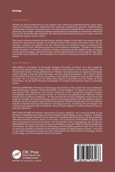 Written by world authorities on the subject, this reference comprehensively covers every aspect of colorectal cancer. Addressing the molecular mechanisms, genetics, identification, and therapy of disease, this guide covers new pharmaceutical developments, current screening protocols, and modern methods of disease management by specialists at renown