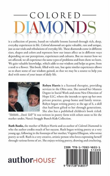 Colored Diamonds is a collection of poems, based on valuable lessons learned through rich, deep, everyday experiences in life. Colored diamonds are quite valuable, rare and unique, just as our trials and tribulations of everyday life. These diamonds come in different sizes, shapes and colors and represent how our issues affect us in different ways depending on our perceptions, experiences and cultures. But no matter how we are affected, we all experience the same types of problems and from them we learn. We gain valuable knowledge, which adds to our wisdom and helps us grow, from a seed to a flower. This book, filled with rare, but quite similar experiences allows us to share some of our wisdom gained, so that we may be a source to help you deal with some of your issues of daily life.